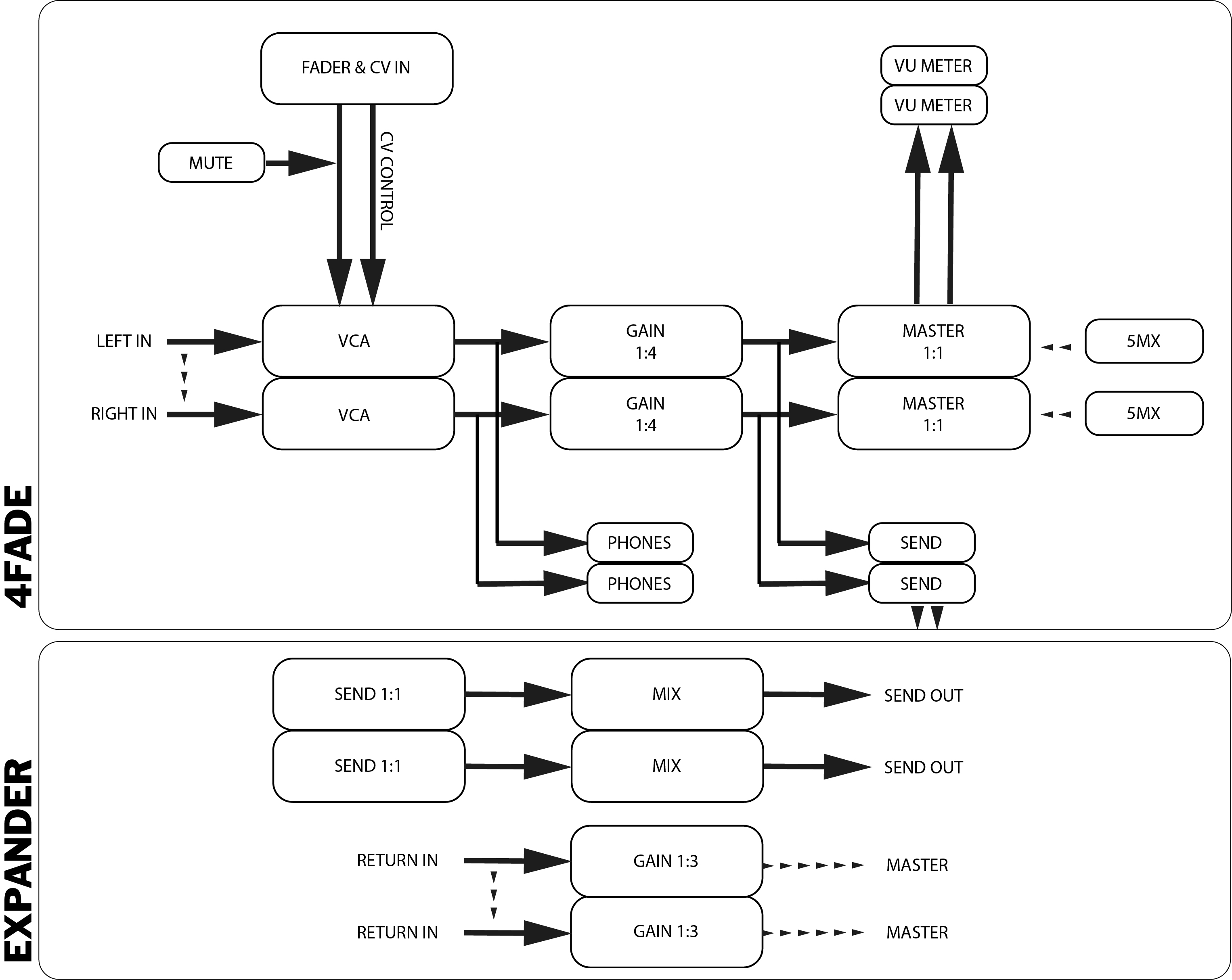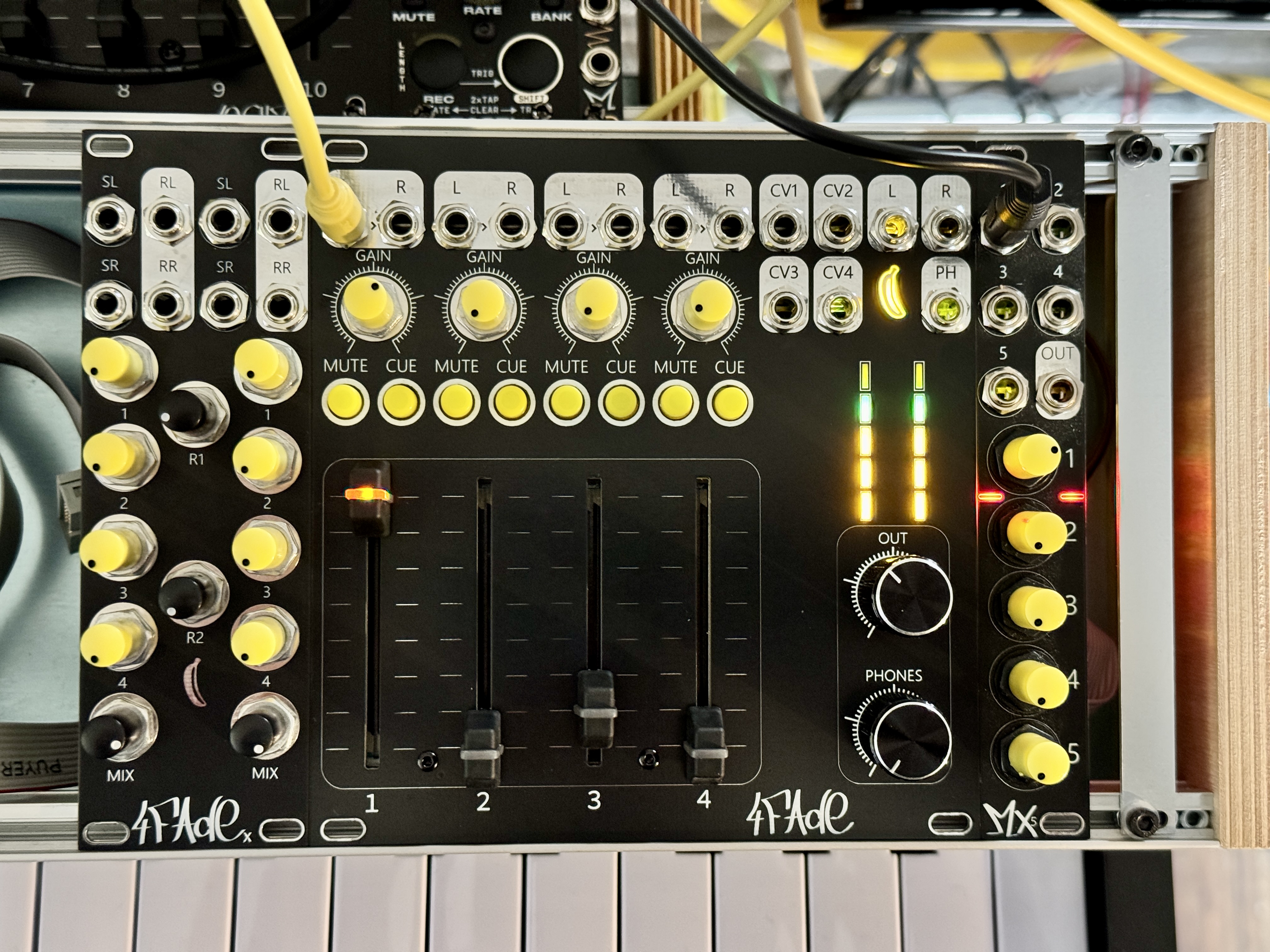 4Fade is a quad, stereo, linear VCA mixer around 2164 ICs with pre listening stereo headphone path and expanding features.