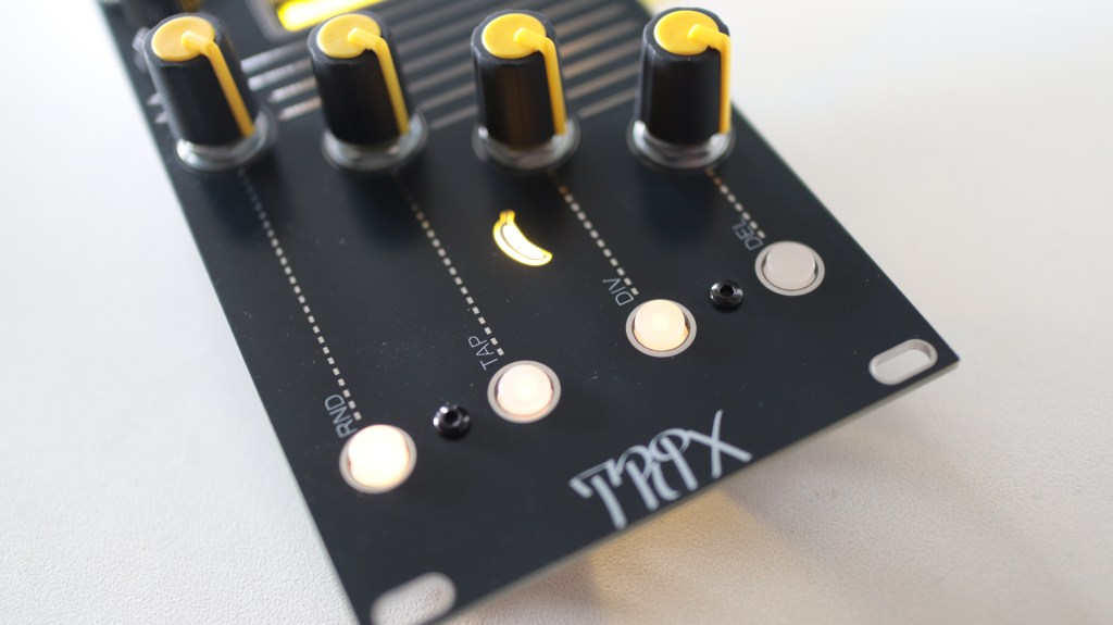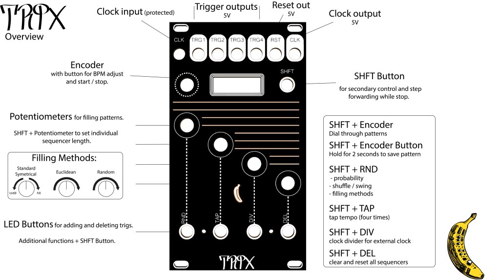 Trix is a 4 channel, 32 steps trigger sequencer with individual pattern length, probability, swing, one knob filling methods per channel and 16 banks for saving patterns.